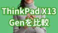 LENOVO ThinkPad X13の違いを徹底比較|Gen1〜Gen6のおすすめはどれ?中古で失敗しない選び方 ThinkPad X13 Genの違いを比較。ThinkPad X13 (Gen1・Gen2・Gen3・Gen4・Gen5・Gen6)の特徴と選び方を解説し、用途別のおすすめ世代を分かりやすく紹介します。中古の注意点もまとめています。 2026.03.22 LENOVO